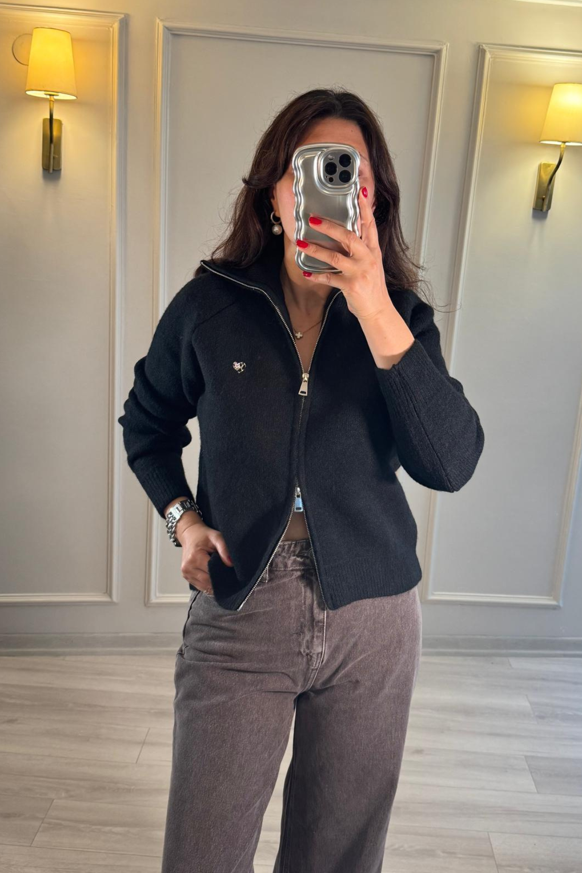 Armalı Çift Fermuarlı Triko Hırka Siyah