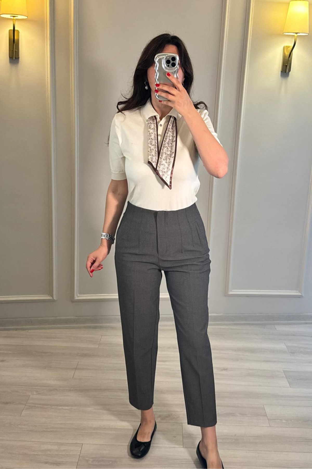 Fularlı Polo Yaka Kısa Kol Bluz Ekru